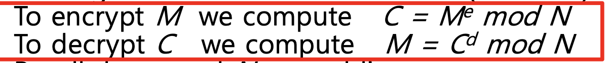 그러면 M 을 암호화 할 때는 M^e mod N 을 계산하고, M을 복호화할 때는 C^d mod N 을 계산한다.