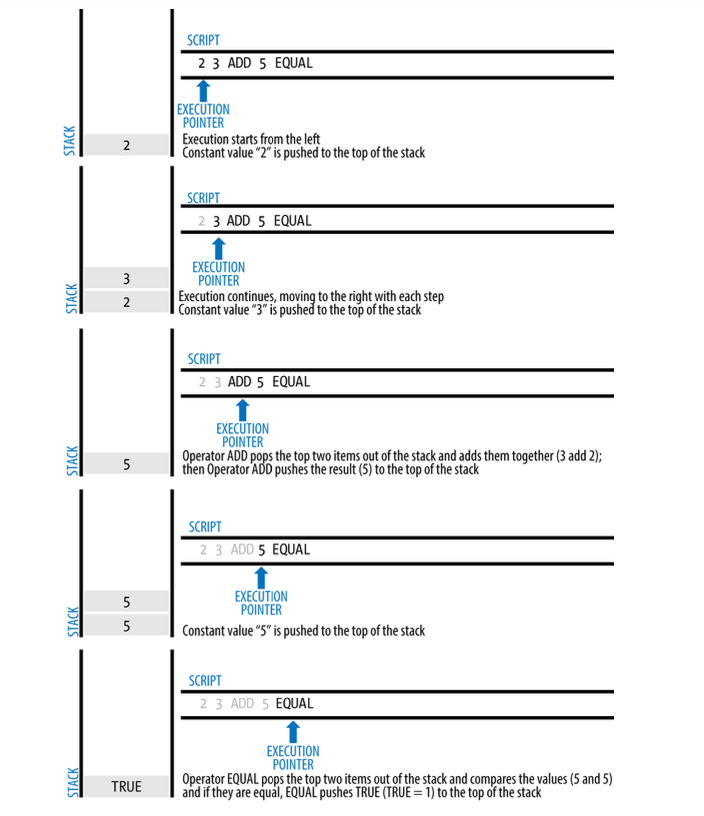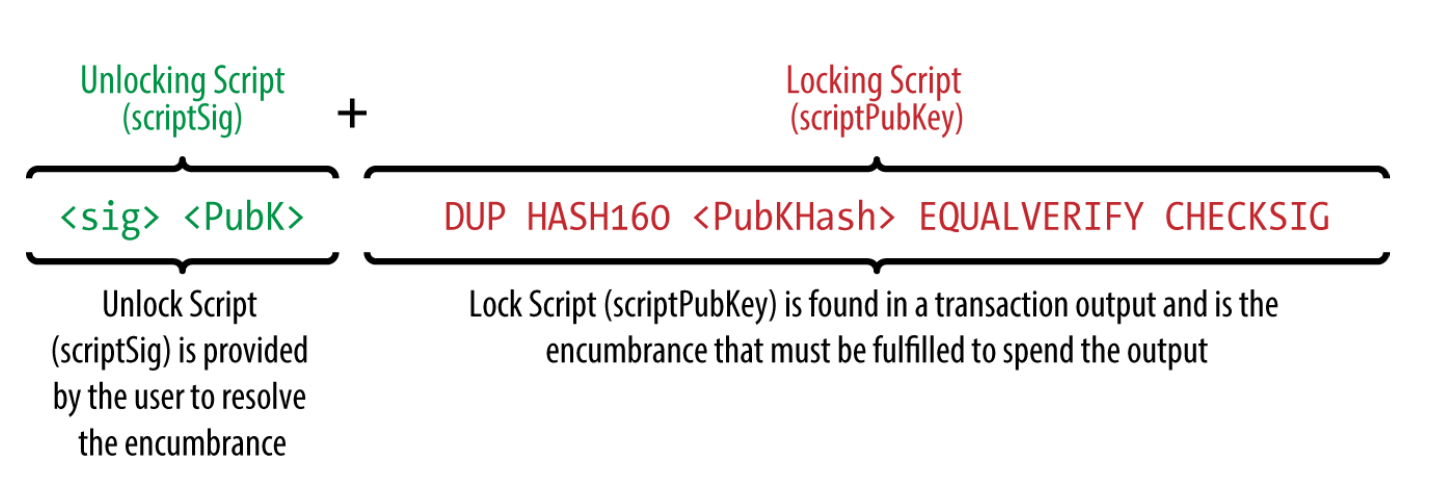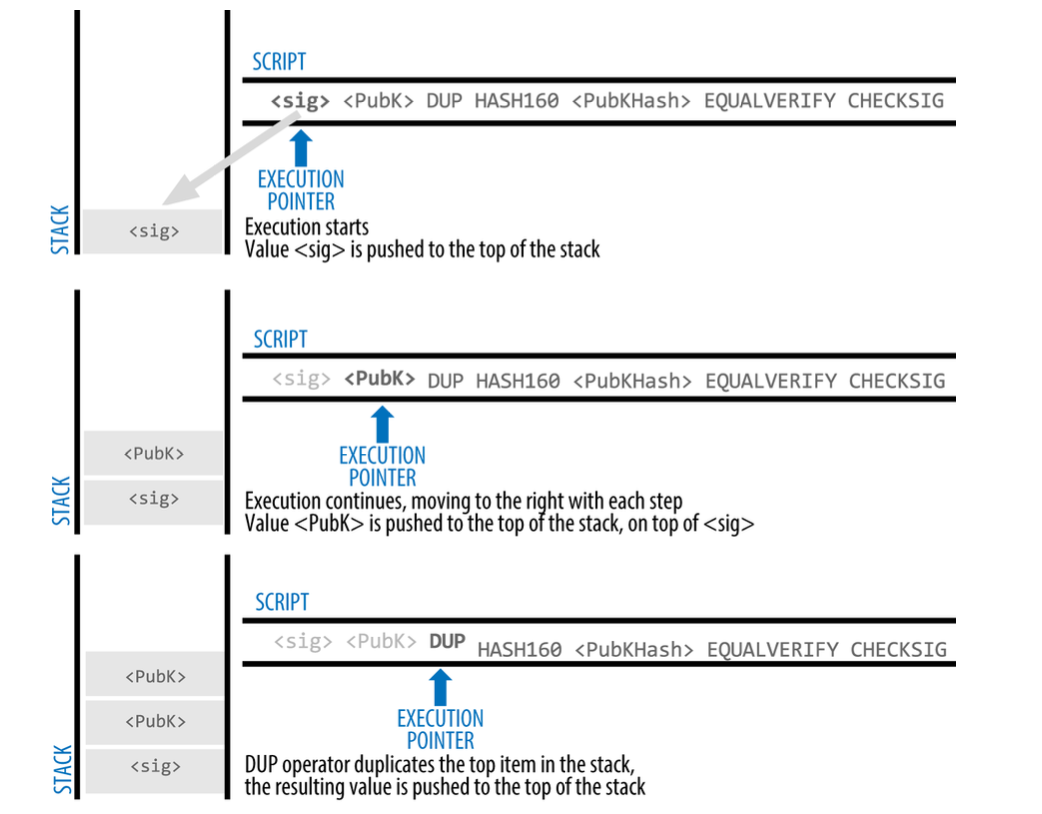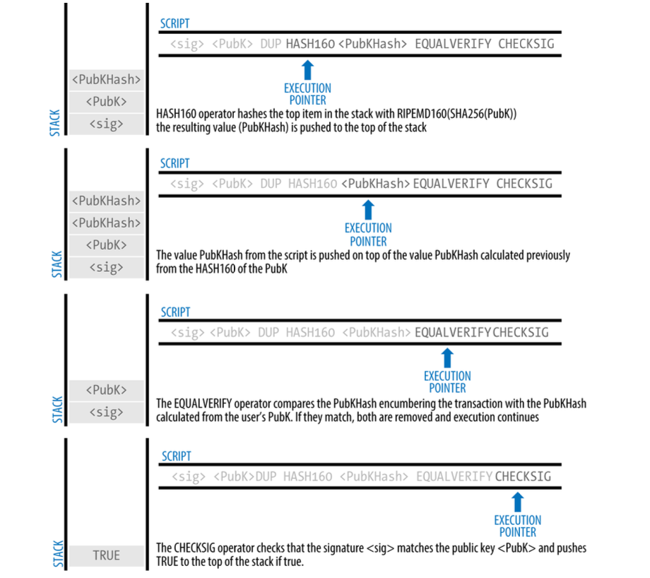 즉, 이전 트랜잭션의 output script 와 현재 트랜잭션의 input script 를 연결해서 실행해봄으로써 검증하는 것이다.