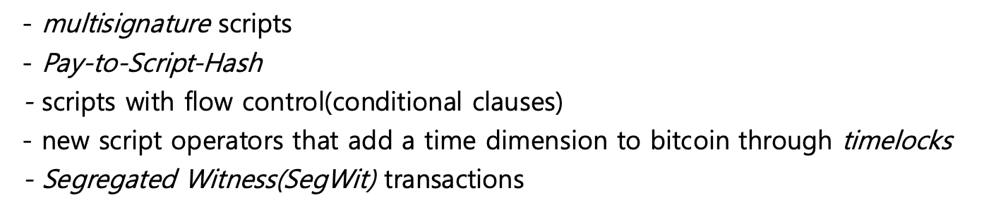 트랜잭션 타입에는 P2PKH 말고도 다양한 종류의 타입이 존재하여 조금 더 복잡한 상황에 대한 트랜잭션을 처리할 수 있다.