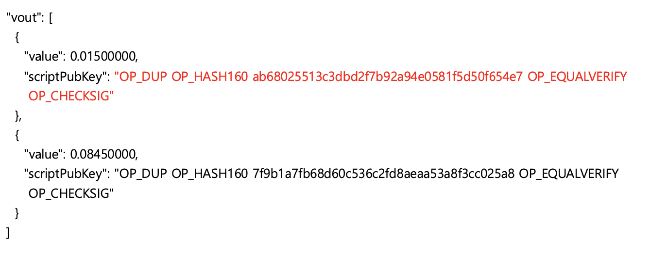 이 output 은 2개의 output을 나타내고, 첫번째 output 은 0.015 를 지불하며 이때 output script 는 scriptPubKey 로 위와 같은 문자열이 들어간다.
