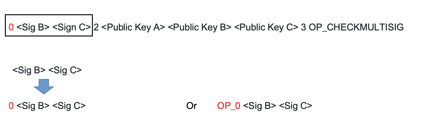 그래서 사람들은 이 버그를 피하기 위해 서명 앞에 0을 포함하여 전송하거나 OP_0 이라는 연산자를 포함하였다.