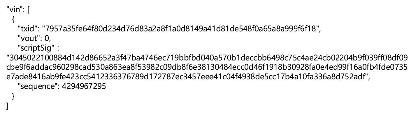 output이 들어있는 트랜잭션 id와 그 output의 인덱스 (0-index), 그리고 output script 에 제시할 서명으로서 scriptSig 가 들어가고, 2^31 보다 작은 값이 들어가므로 relative lock time 까지 시퀀스로 제시하고 있음을 알 수 있다.