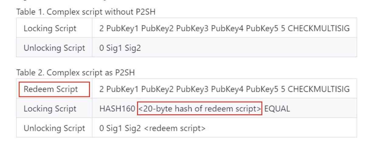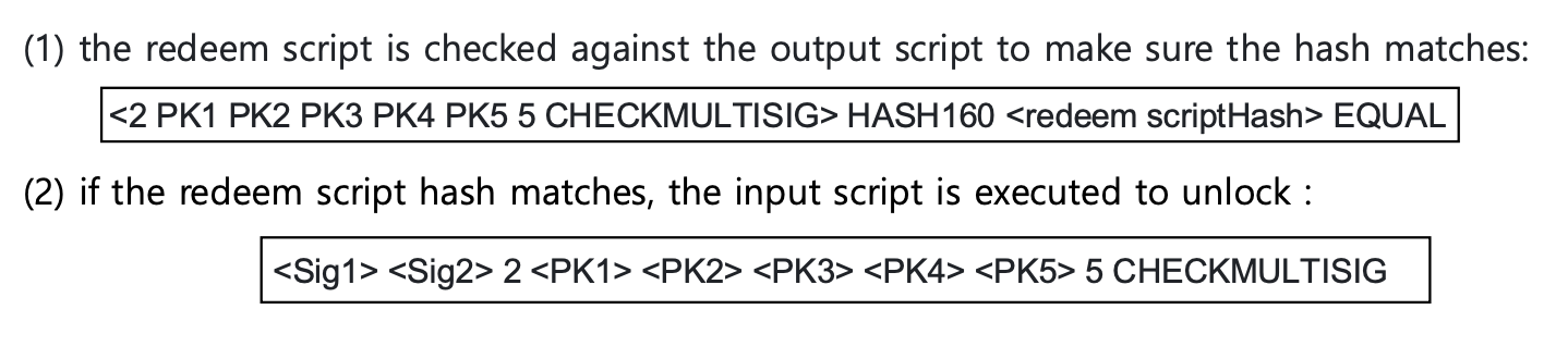 따라서 redeem script 는 블록 체인만 들어가면 된다. (UTXO에는 들어갈 필요가 없으므로)