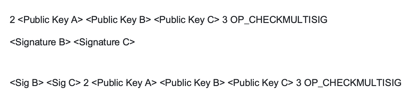 그래서 예시를 보면 첫번째 줄과 같은 output script 가 있으면, input script 로는 2개의 서명을 제시하고, 풀 노드가 검증할 때는 이를 이어붙어서 <Sig B> ... 와 같은 스크립트를 실행해보게 된다.