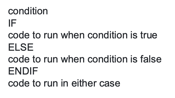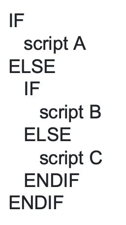 먼저 condition 을 제시하고 if 로 True 인지 체크하고, 그러면 그 다음 스크립트 코드가 실행되고 아니면 ELSE 에 넘어가서 그쪽의 코드가 실행되고, ENDIF 이후의 코드는 항상 실행된다. 또한 이런 컨디션은 얼마든지 중첩될 수 있다.