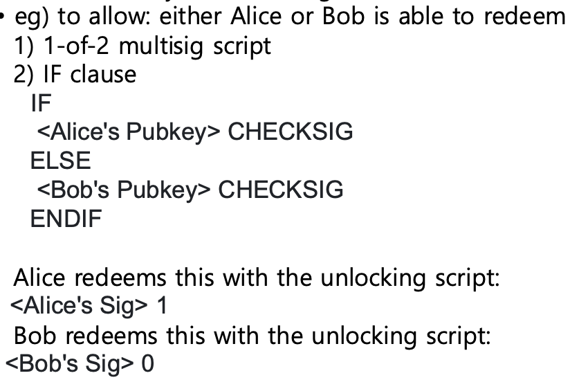 이떄는 위와 같이 output script 를 작성하고, input script 는 앨리스의 서명을 쓰는 경우 1을 밥의 서명을 쓰는 경우 0을 같이 넘기면 된다. (1 = true 로 간주하고 0 = false로 간주한다.)