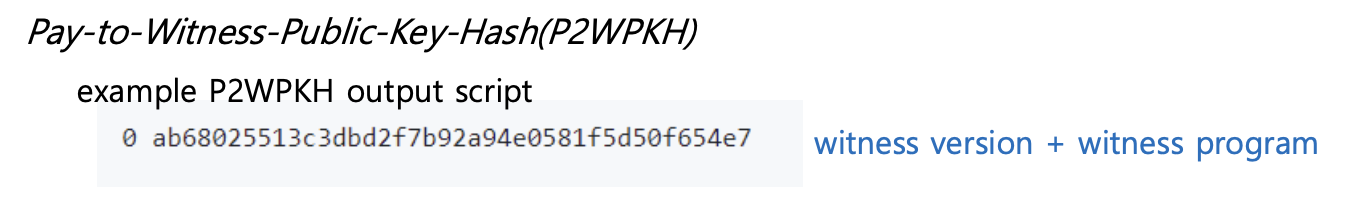 하지만 SegWit이 적용된 Pay-to-Witness-Public-Key-Hash (P2WPKH) 방식에서는 위와 같은 형태로 witness version 과 witness 프로그램이 합쳐진 output을 사용한다.