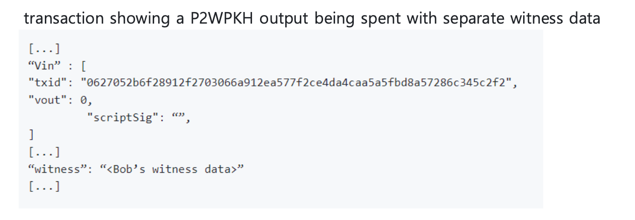 그리고 이 ouput을 가져다가 지불에 사용하고자 할 때는 input script 를 비워놓고 witness 영역에 밥의 witness 데이터를 제공하면 된다. 세그윗은 송신자와 수신자가 모두 세그윗을 지원해야 한다.