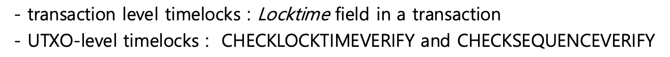 타임락은 이렇게 트랜잭션 레벨의 타임락과 UTXO 레벨의 타임락으로 구분이 될 수 있다.