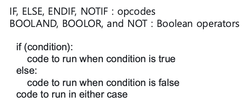 이떄는 위와 같이 output script 를 작성하고, input script 는 앨리스의 서명을 쓰는 경우 1을 밥의 서명을 쓰는 경우 0을 같이 넘기면 된다. (1 = true 로 간주하고 0 = false로 간주한다.)