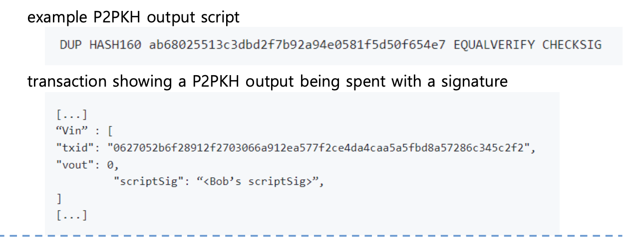 이 output 을 가져다가 사용하려고 하는 경우, 서명을 제시할 때는 input script 로 서명 데이터를 제시해야 했다.