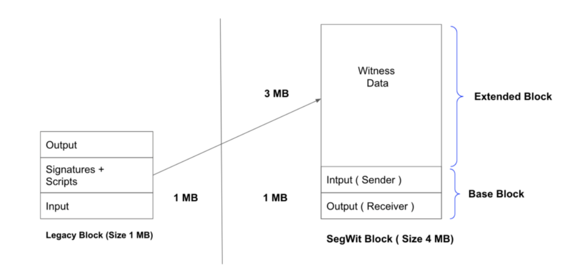 그래서 기존의 base block 은 1MB를 유지하되 segwit 부분을 추가적인 블록으로 만들어 총 4MB의 블록으로 크기를 증가시키게 되었다.