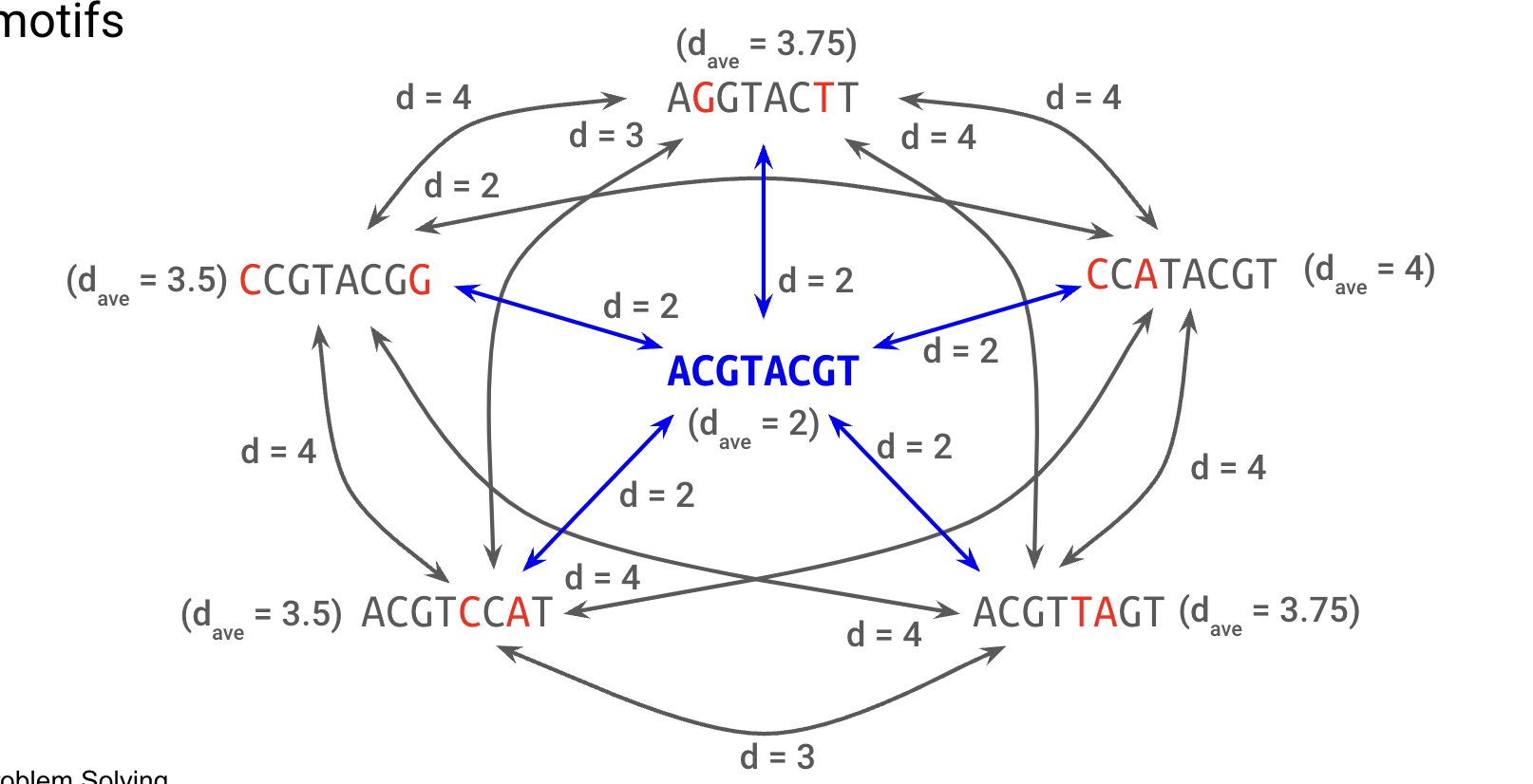 Consensus motif 와 실제 motif 사이의 '거리' 는 일반적으로 그 어떤 실제 motif 2개의 거리보다도 가깝다.