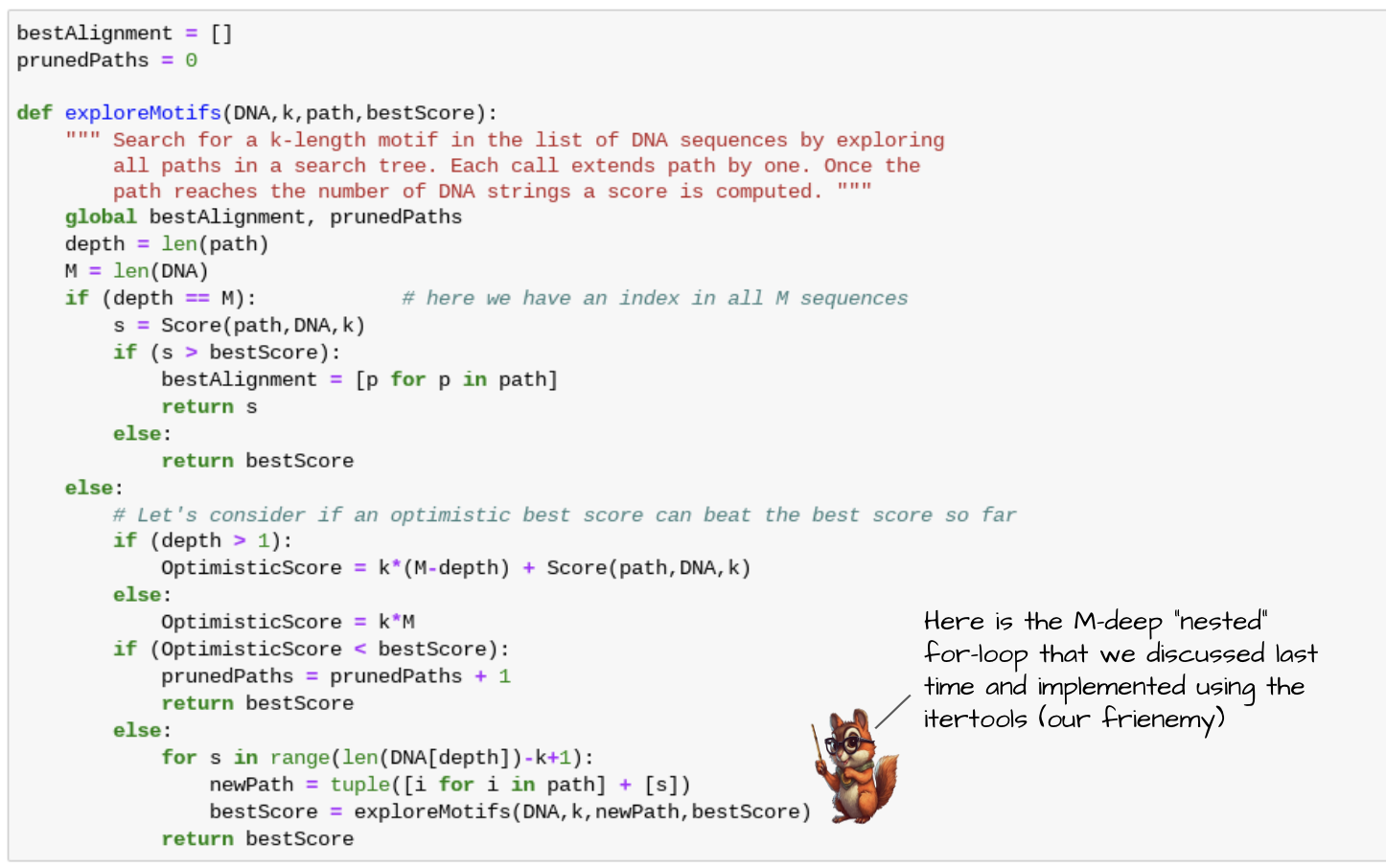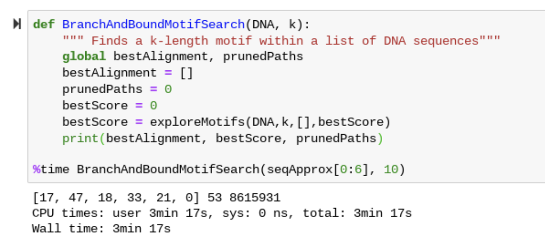 위에서 정리한 가지치기 알고리즘을 적용한 motif searching 알고리즘이다.