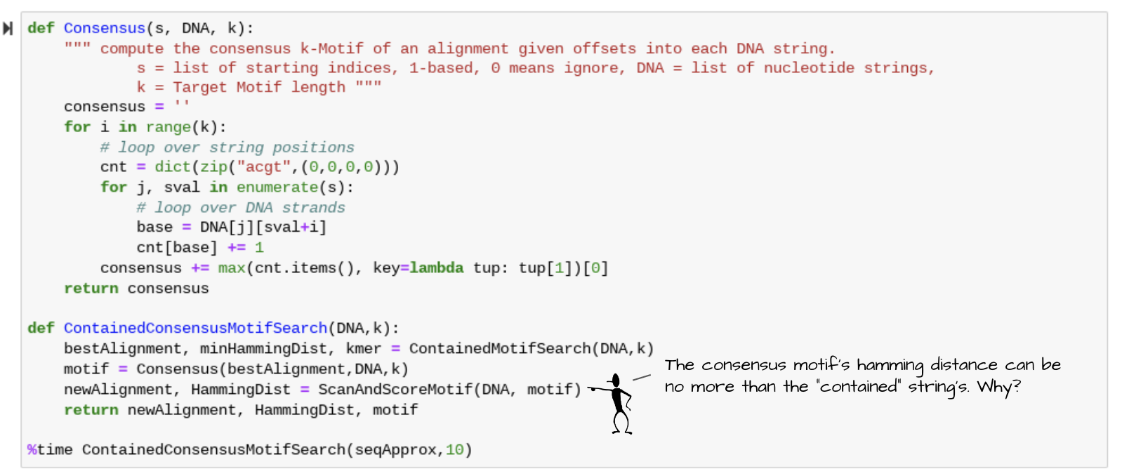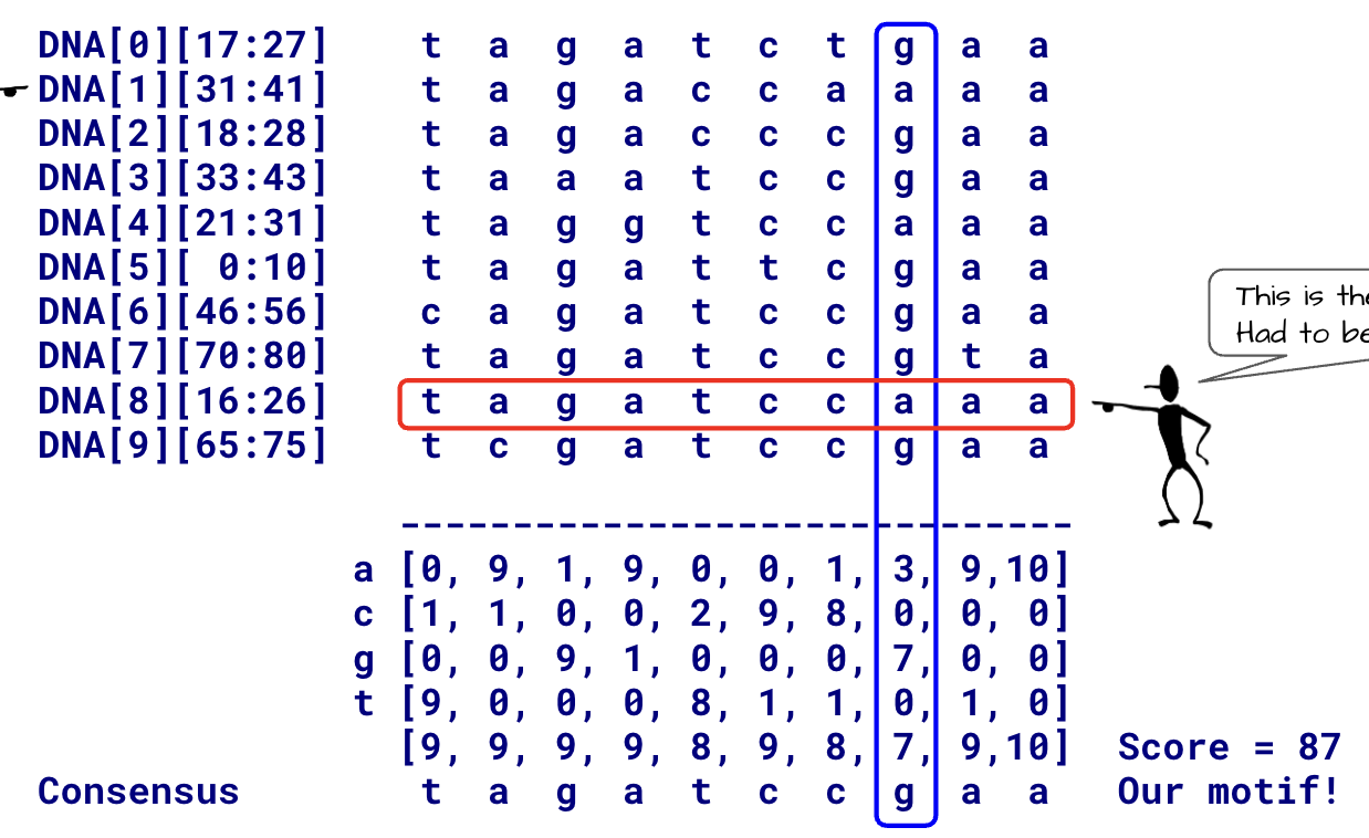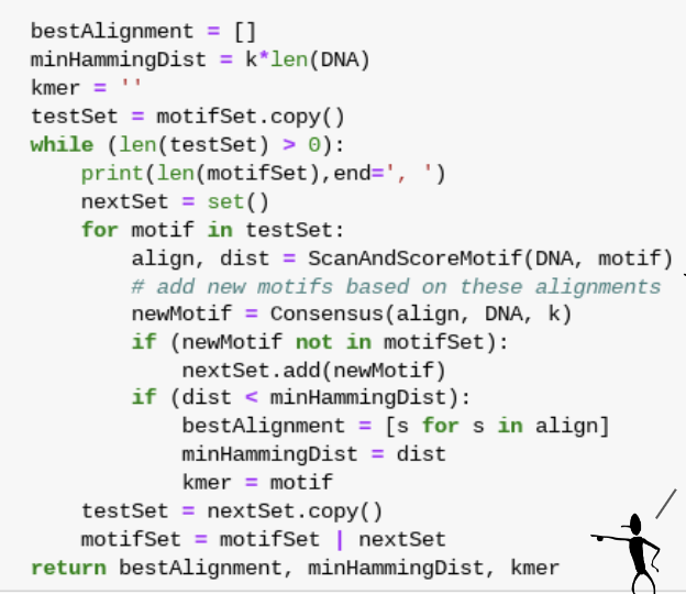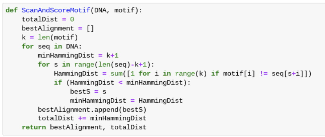 기준이 될 motif 를 4**k 가지 다 만들고, 이 기준 motif 에 대해 ScanAndScoreMotif 함수를 매번 적용해서 최적해를 내뱉는 기준 motif 를 찾는다.