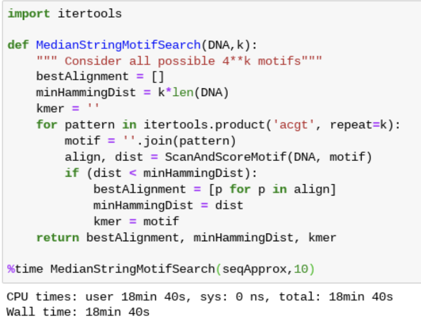 이는 각 Score 함수의 실행 시간은 짧았지만 motif 조합을 다 해봐야했기 때문에 Score 함수의 호출 횟수가 너무 많았기 때문이다.