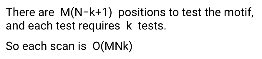 그러면 그 motif 를 M개의 DNA 에서 찾는 시간은 훨씬 적게 걸릴 것이다.
