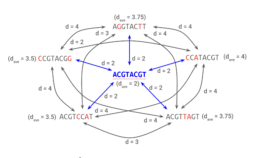 min hamming distance 를 찾는 것은 M개의 문자열들 사이의 거리를 그래프로 나타낼 때, 모든 문자열들과의 거리가 같은, 즉, 모든 문자열들의 가운데에 존재하는 문자열을 찾는 것과 같기 때문에 Median String 이라는 이름을 붙였다.