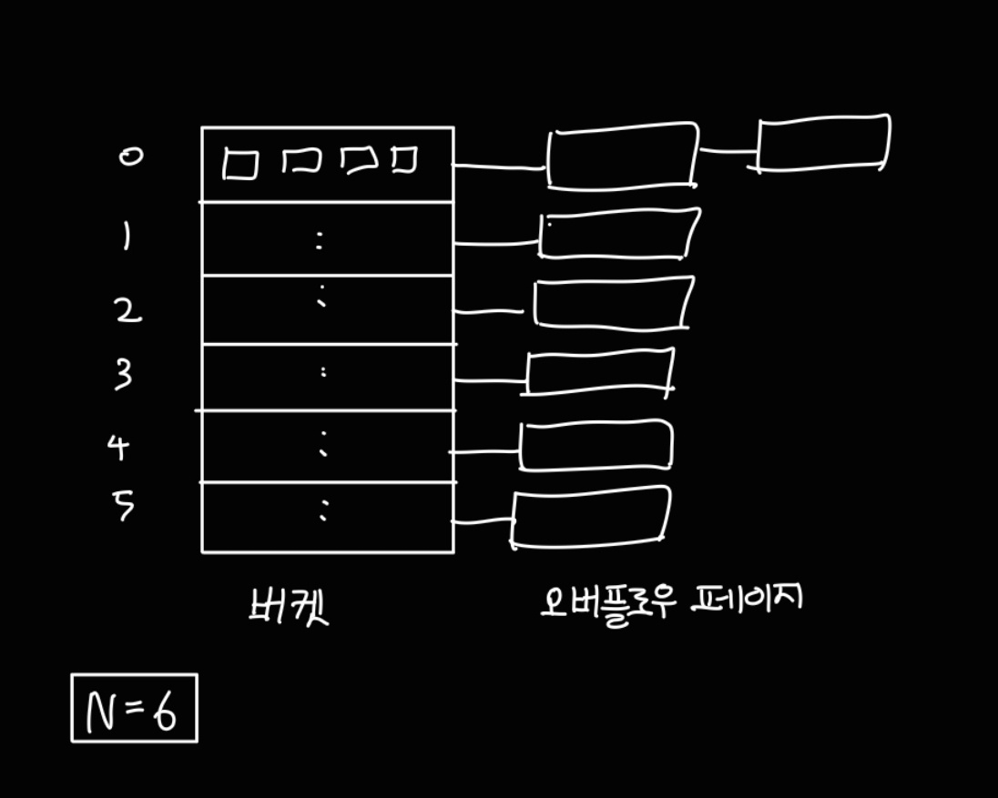 만약 새로운 데이터를 추가하려고 하는데, 해싱 결과 해당 버킷 페이지에 이미 데이터 엔트리를 추가할 공간이 없다면 overflow page를 만들어 저장한 뒤 해당 버킷 페이지의 오버플로우 체인에 연결한다.