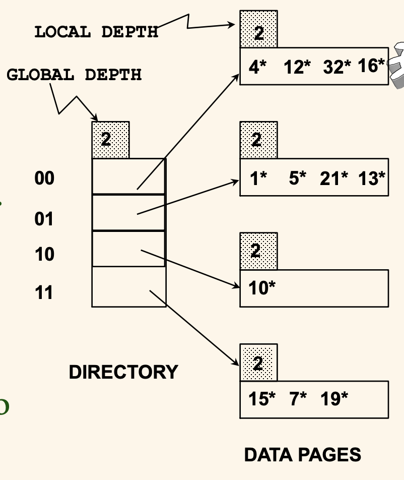 디렉토리에는 Global Depth, 각각의 데이터 페이지에는 Local Depth 가 있는데, Global Depth 는 디렉토리의 모든 레코드를 식별하는데 필요한 비트 수, Local Depth 는 해당 페이지를 식별하는데 필요한 비트 수를 나타낸다.