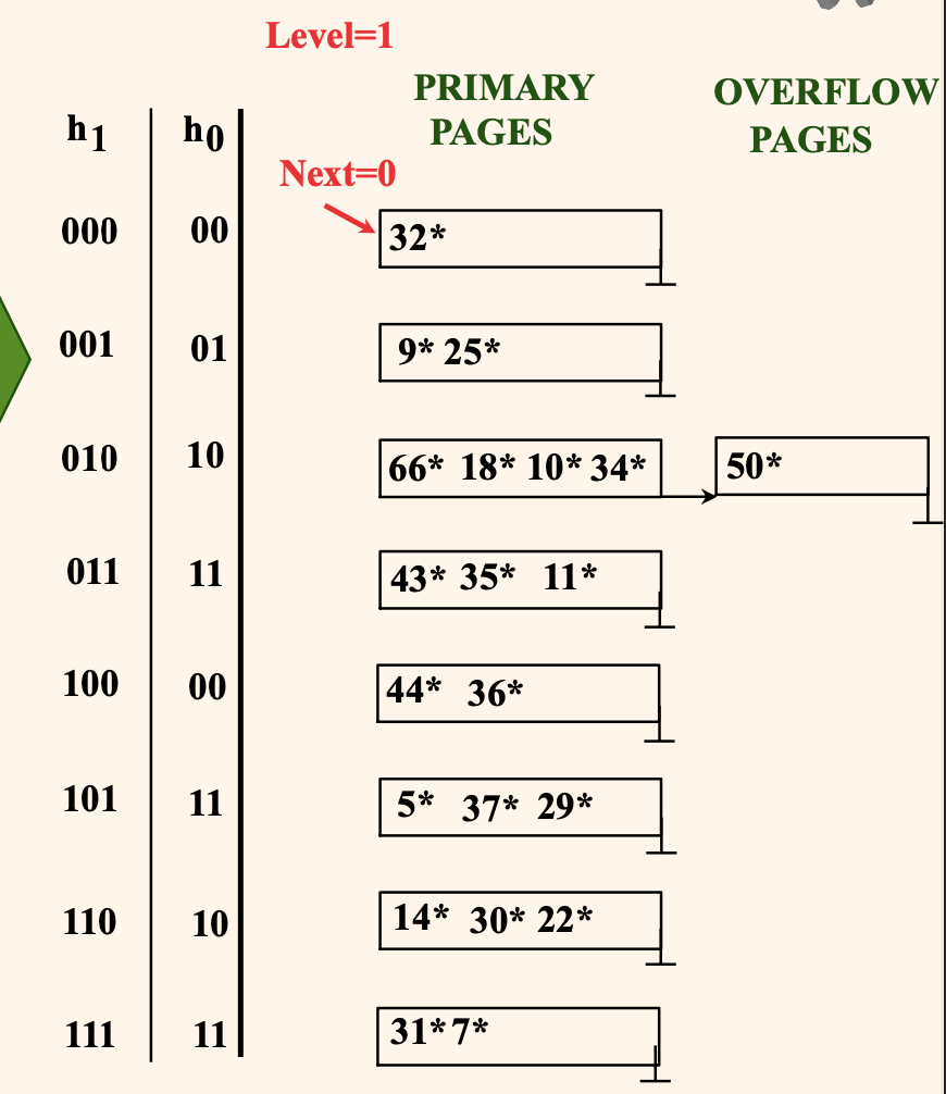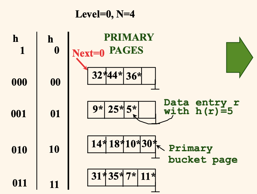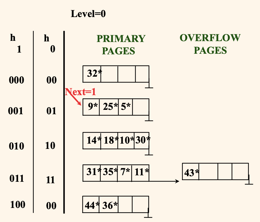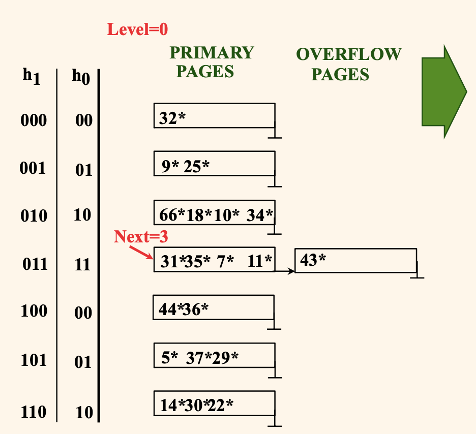 위 그림을 예시로부면, 현재 Level = 0 인 상태에서 0부터 Next - 1 = 0 까지는 분할된 버켓이고 (0번 버켓은 분할되어 있다.)