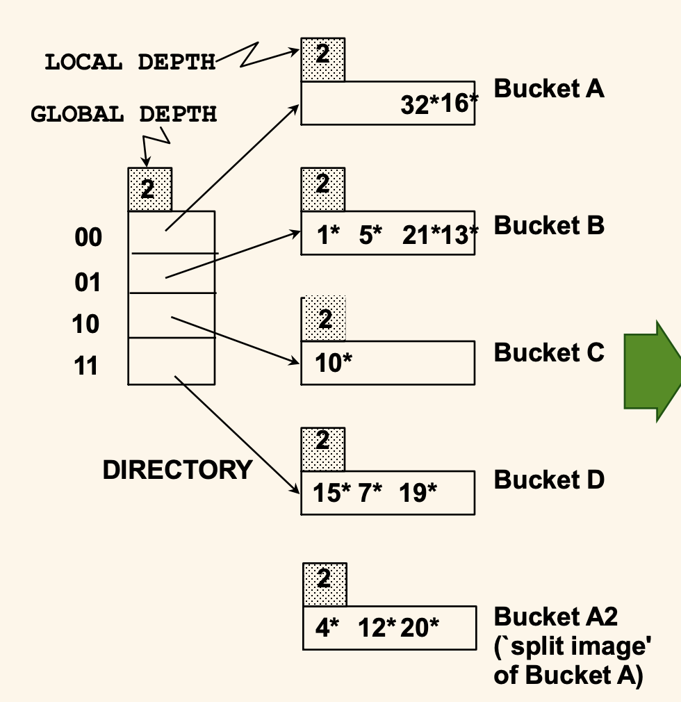 아직 Local Depth 가 2인 데이터 페이지를 식별할 때는 디렉토리에서 하위 2비트가 같은 칸이 같은 데이터 페이지를 가리키도록 하고, 쪼개진 A, A2 는 각각 000, 100 이 가리키도록 포인터를 나눔으로써 오버플로우 페이지 없이 데이터를 저장할 수 있다.