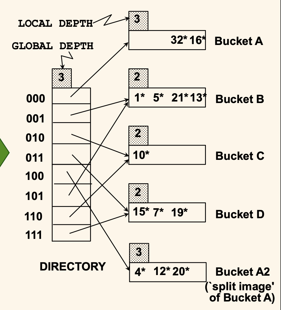 디렉토리에는 Global Depth, 각각의 데이터 페이지에는 Local Depth 가 있는데, Global Depth 는 디렉토리의 모든 레코드를 식별하는데 필요한 비트 수, Local Depth 는 해당 페이지를 식별하는데 필요한 비트 수를 나타낸다.