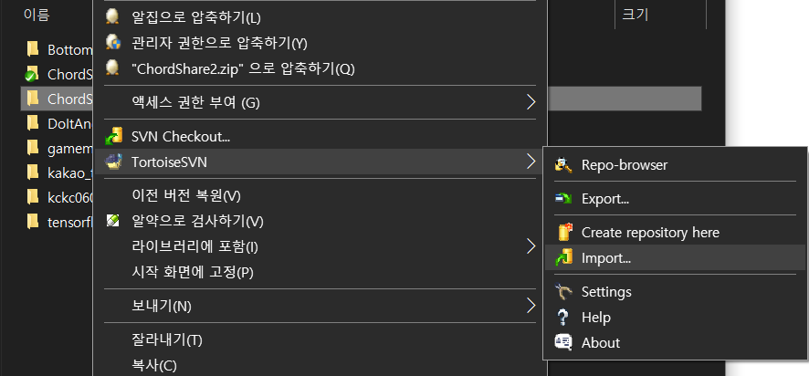 TortoiseSVN - Import 를 눌러 임포트를 진행한다.