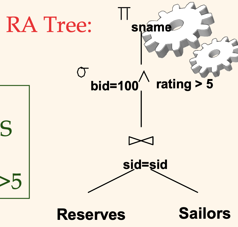 이 수식은 다음과 같이 관계 대수 연산자 트리로 표현할 수 있다.