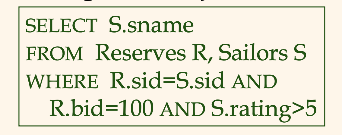 π_sname (σ_bid=100^rating>5 (Reserves ⨝_sid Sailors))