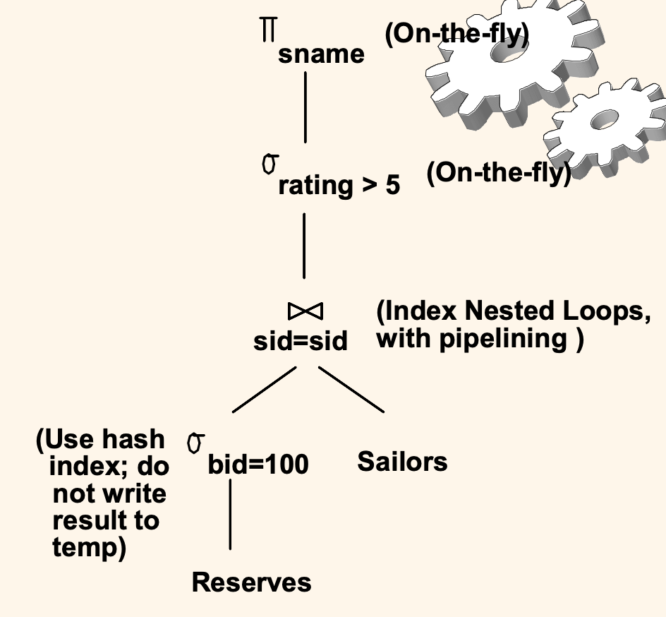 만약 Sailors 테이블의 sid 가 군집 인덱스라면, bid = 100 실렉션 연산을 임시 테이블에 실체화 시키고 sid 기준 정렬한다.