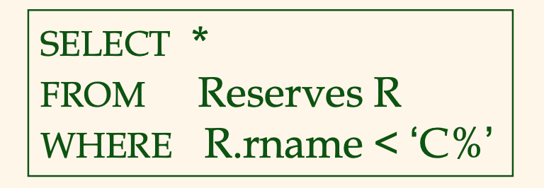 관계 대수로는 R.rname < 'C%' 조건에 맞는 셀렉션 연산으로 표현할 수 있다.