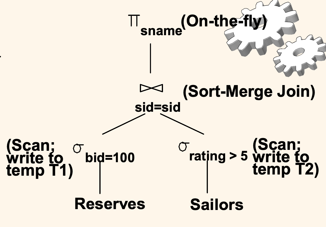 따라서 Sailors 테이블을 full scan 할 때 500 개 페이지를 읽어오고, T2를 쓸 때는 250 페이지를 쓴다. (T2를 디스크에 저장)