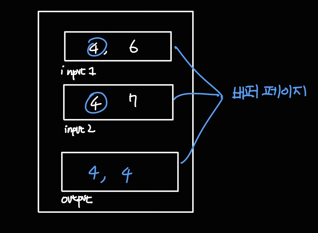 각 페이지에서 앞에 있는 레코드를 비교하여 <4, 4> 를 output 페이지로 만들어 내보낸다.