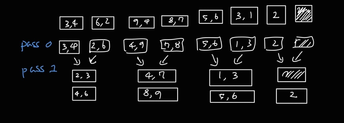 위 예시에서는 <2, 3> <4, 6> 과 <4, 7> <8, 9> 를 병합할 것이다.
