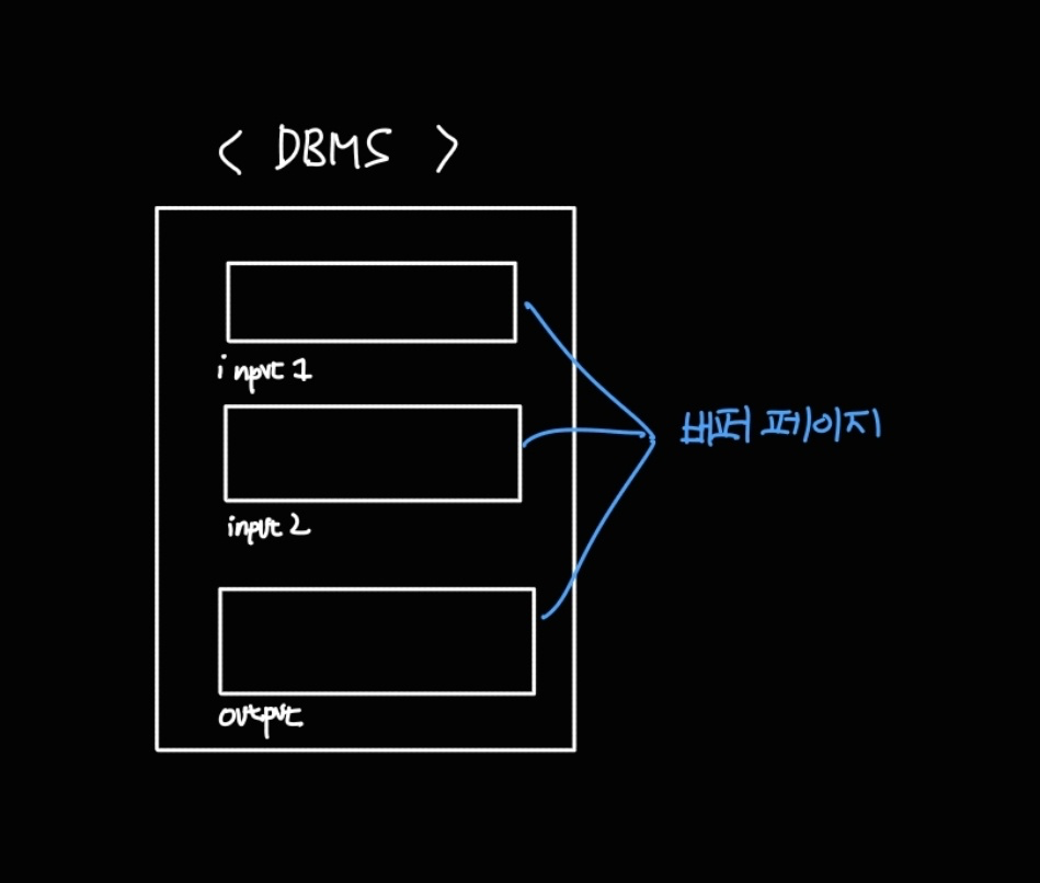 3개의 버퍼 페이지 중 2개는 정렬할 페이지를 받는 버퍼 페이지 이고, 하나는 정렬 결과를 내보내는 페이지이다.