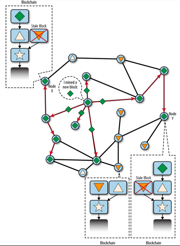 분산 시스템의 특성상, 어떤 특정 시점에 딱 봤을 때 모든 full node가 정확히 동일한 블록체인의 형태를 보고 있지 않을 수는 있다.