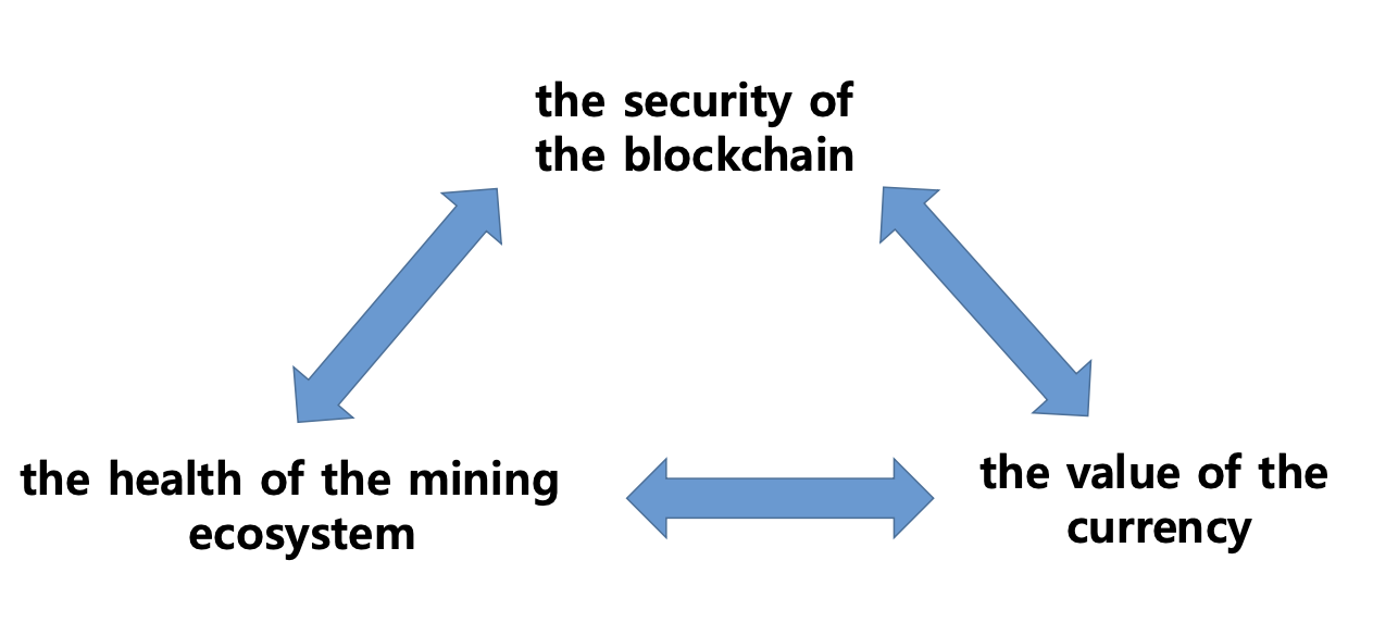 블록체인 자체의 안전성, 코인의 가치 유지, 마이닝 시스템이 얼마나 잘 유지되는지는 서로가 서로에게 영향을 끼칠 수 있다.
