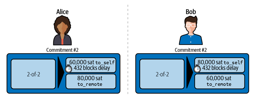 이때 remote_key 에 대한 서명은 앨리스가 밥에게 제공해야 하며, remote_key에 대한 서명은 commitment #2 트랜잭션 이후에 commitment #3 트랜잭션을 만들 때 밥에게 #3에 대한 서명을 받은 후 제공한다.