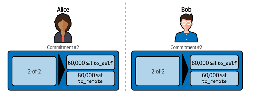 commitment #2 트랜잭션은 앨리스에게 6만, 밥에게 8만 사토시를 보내는 트랜잭션이다.