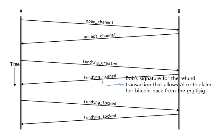 따라서 펀딩 트랜잭션을 뿌리기 전에 B에게 펀딩 트랜잭션의 해시값을 주고 Refund Transaction에 대한 서명을 요구한다.