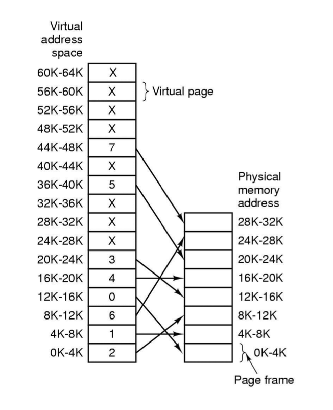 실제 메모리의 크기가 256MB 라고 하면, 같은 크기의 페이지로 분할했을 때 2^16개의 page frame이 존재한다.