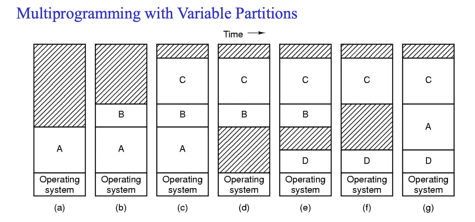 위 그림은 멀티프로그래밍 방식에서 가변 파티션을 사용하는 모습을 보여준다.