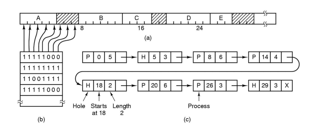 위 그림은 물리 메모리 (a) 에 할당된 프로세스를 Bit Map 으로 관리하는 모습 (b), 연결 리스트로 관리하는 모습 (c) 을 함께 보여주고 있다.