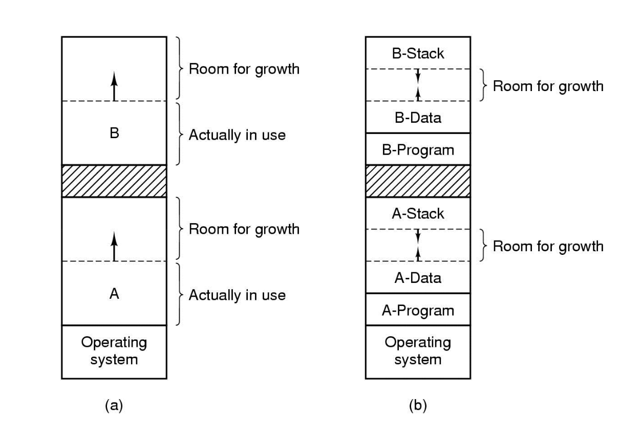 프로세스를 메모리에 적재할 때는 (a) 와 같이, 실제로 사용하는 영역의 크기에 더해 추가적으로 사용할 수 있는 여분 공간을 함께 할당한다.
