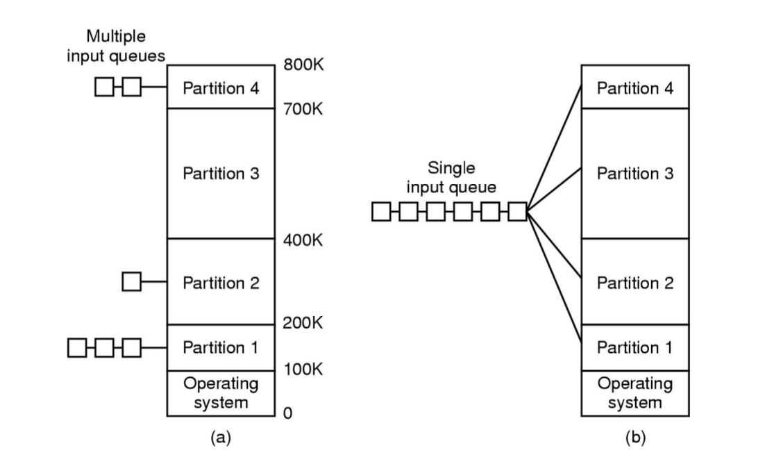 먼저 (a) 방법은 다양한 고정된 크기의 파티션을 미리 나눠두고, 각각의 파티션마다 큐를 둔다.