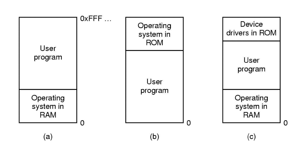 (c) 방법은 PC가 등장한 이후에 주로 사용하는 방법으로, 메모리 낮은 주소에 OS를 두고, 그 위에서 유저 프로그램을 실행한다.