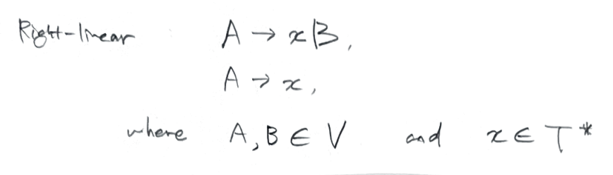 위와 같이 모든 변수가 오른쪽에 몰려있는 문법을 Right-Linear Grammar 라고 한적이 있다.