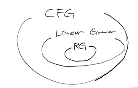 그리고 이 예제까지 보면, CFG, Linear Grammar, RG는 위와 같은 포함 관계를 갖는 것을 알 수 있다.
