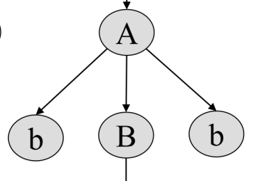 다시 A는 bBb 를 produce 하므로, 그 각각의 요소 b, B, b 를 노드로 하는 정점을 자식으로 갖도록 구성하고, 계속해서 등장하는 변수에 대해 같은 과정을 반복한다.